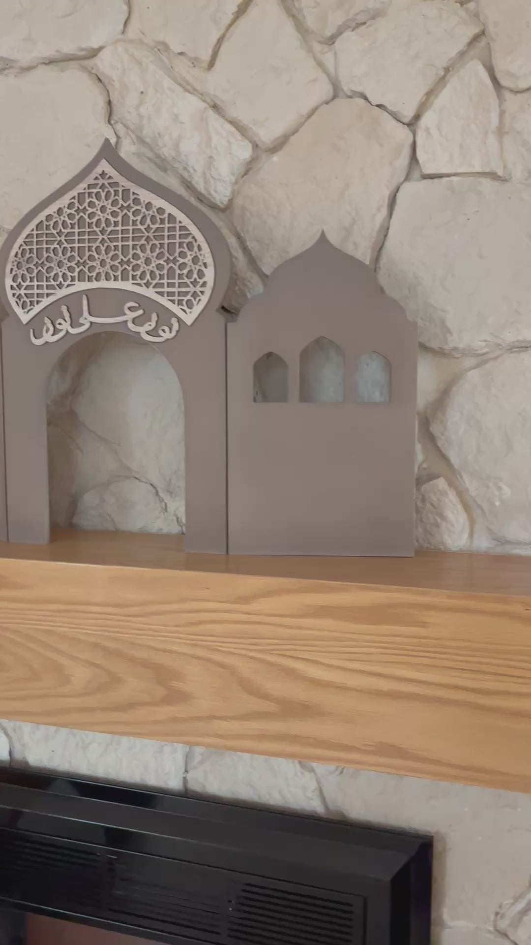 Elevate your home décor with this stunning three-panel wooden decorative piece inspired by traditional Islamic architecture. Featuring intricate laser-cut details in the central arch and symmetrical window designs on the side panels, this freestanding decoration brings timeless elegance to any space. The addition of the Arabic phrase "Noor Ala Noor" (نورٌ على نور) brings a unique charm, symbolizing the divine light that illuminates the sacred mosque silhouette, making this piece even more special.